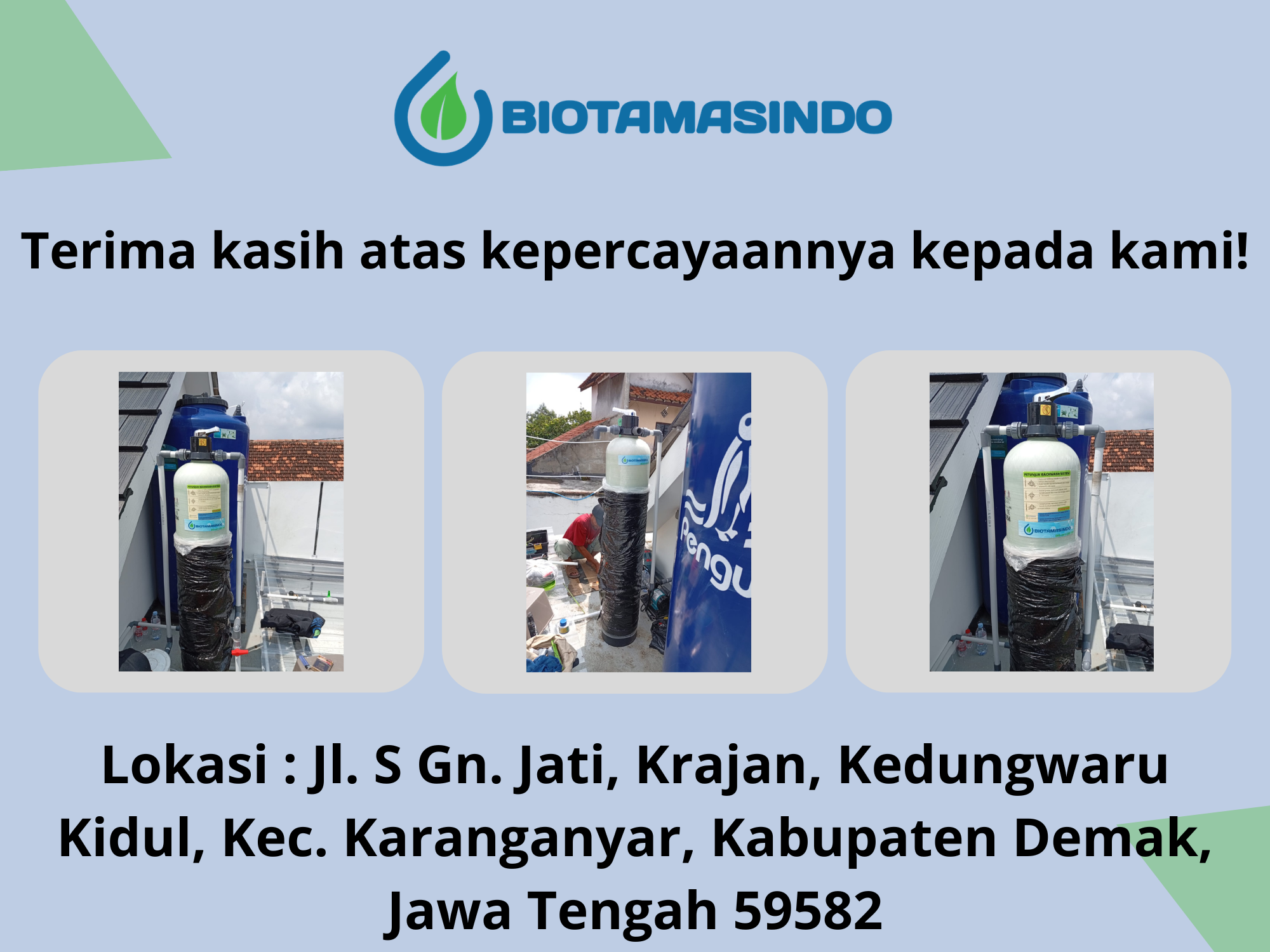 Bagi warga karangayar demak maupun sekitarnya, silahkan hubungi BIOTAMASINDO sebagai ahli dalam bidang water treatment untuk membantu masyarakat mendapatkan air bersih layak digunakan sesuai DEPKES. Kami memiliki tenaga ahli yang sudah berpengalaman lebih dari 10 tahun dengan admin untuk membantu memberikan solusi GRATIS 24JAM. Klik link dibawah ini juga untuk mendapatkan informasi seputar pengolahan air secara akurat dan terpercaya maupun portofolio dari BIOTAMASINDO. Kita juga ada promo untuk user baru baik untuk rumah tangga hingga industri. Semua produk dari BIOTAMASINDO memiliki garansi resmi, baik garansi unit, pelayanan maupun hasil akhir. Kita tetap akan memantau dan membantu user baru dan user lama untuk jangka panjang dan selalu siap dalam 24jam.