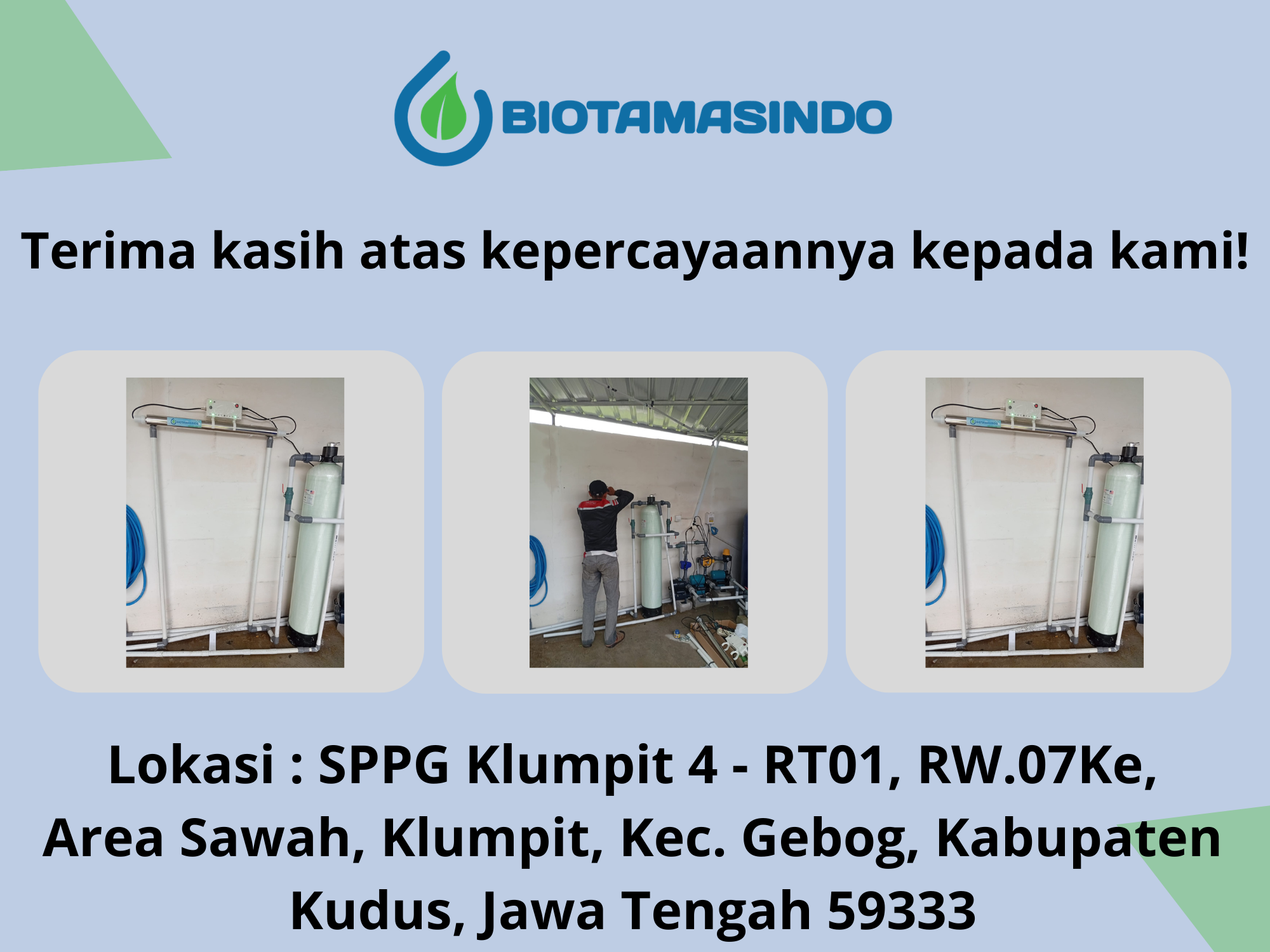 Salah satu program pemerintah yang mewajibkan menggunakan sistem filterisasi ultra violet adalah program makan bergizi gratis ( MBG ) untuk para anak anak penerus bangsa, ibu hamil dan lansia. Pemerintah paham karena filterisasi disini sangat penting karena air adalah salah satu kebutuhan pokok dan fatal jika bermasalah. Wajib menggunakan filter penyaringan dengan sistem ultra violet sesuai aturan kemenkes. Salah satu dapur MBG yang berada di kabupaten kudus SPPG Klumpit 04 mempercayakan kebutuhan sinar ultra violet dengan menggunakan produk dari BIOTAMASINDO.
