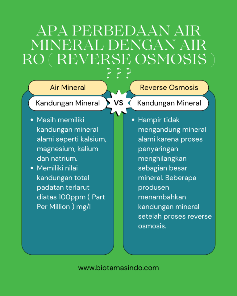 Proses terbentuknya air minum mineral dan air minum RO ( Reverse Osmosis ) sangat berbeda signifikan. Keduanya menggunakan sistem filterisasi yang berbeda dengan maksud dan tujuan sama yaitu menghasilkan air minum layak konsumsi. Air mineral menggunakan sistem filterisasi dengan mempertahankan kandungan mineral yang ada, dengan menghilangkan kontaminan jahat dan bakteri jahat. Sedangkan air minum RO menyaring semua kontaminan dan menghilangkan kandungan bakteri, mendekati air murni yang hanya mengandung H2O saja. - KANDUNGAN MINERAL.
