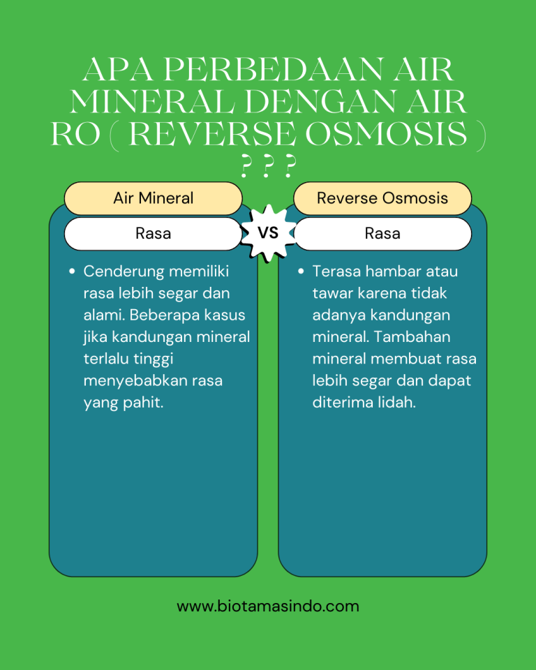 Rasa yang dihasilkan kedua jenis air minum tersebut sangat berbeda. Sebagian besar masyarakat indonesia masih belum bisa menerima rasa dari air RO karena hambar dan pahit, akan tetapi perkembangan modern sekarang menghasilkan sistem bio energy untuk menambah rasa pada hasil air RO agar diterima masyarakat. - MANFAAT ATAU DAMPAK.